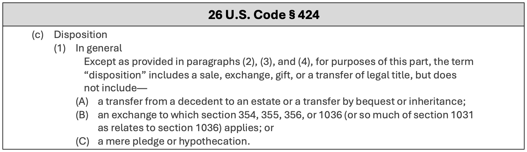 A Grantor Retained Annuity Trust (GRAT) is a popular tool for employee estate planning. Here’s what Section 424(c) of the IRC says about determining whether a transfer to a GRAT or living trust constitutes a disposition.